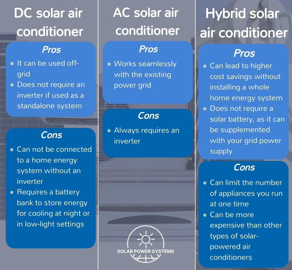 - Solar air conditioning system type: solar panels for AC and DC systems and hybrid solar air conditioners are the three varieties of solar-powered air conditioning. When solar energy is unavailable, hybrid variants are powered by batteries or the electrical grid. In contrast, solar panel systems are linked to solar panels for power generation that supplies the air conditioning unit.