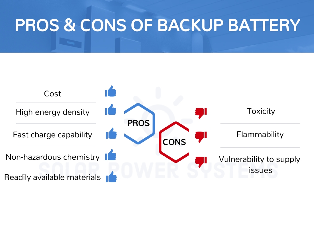 • Lithium-ion batteries. Made of lithium-ion, these backup batteries are more costly than lead-acid but last longer, have more energy, and need less maintenance. They are employed in solar backup generators owing to their efficiency and longevity. The projected lifespan is 15 to 20 years.