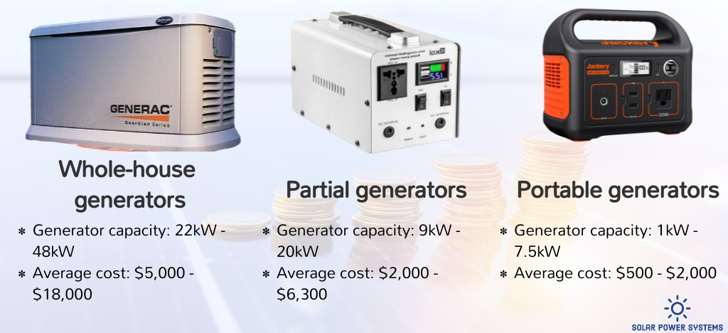 Backup generators have been the preferred option for supplying domestic emergency power. By size, model, and manufacturer, the mean cost of a generator can vary substantially. The cost of a generator for home backup power can range from $4,000 to $25,000. As the cost of a generator will fluctuate based on its capacity, it is critical to assess and comprehend the power requirements of your residence.