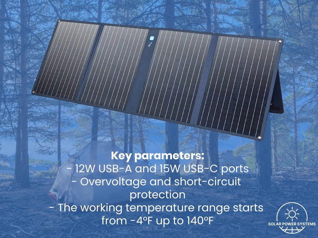These solar panels for campers have a 23.5% efficiency and produce up to 28 Watts. With two USB-A ports (5V/4.8A total), you can charge two devices simultaneously, for instance, a phone in 2-3 hours and a laptop in 7-8 hours. While unsuitable for a mini-fridge, it’s great for essential mobile devices.