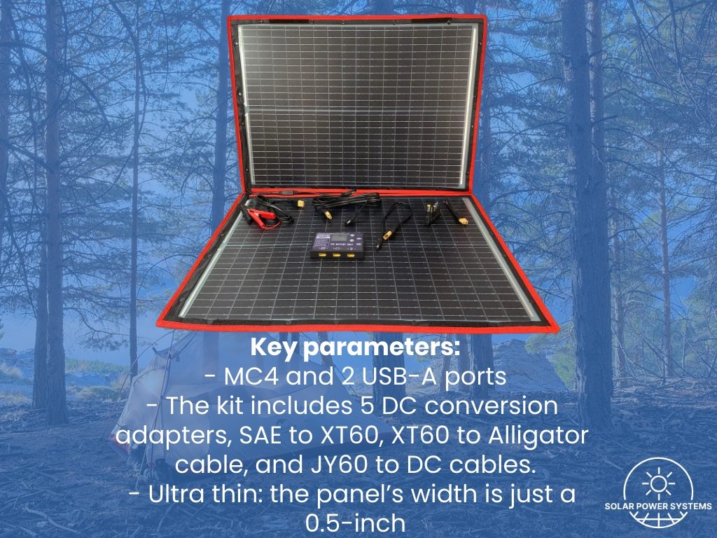 • Built-in MC4 connector, USB-A, and USB-C adapters in a set