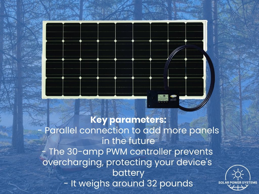 • The 30-amp PWM controller prevents overcharging, protecting your device’s battery