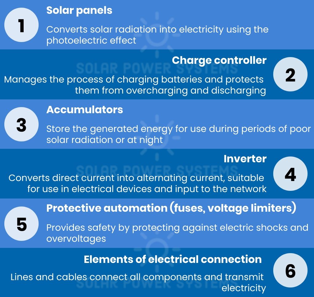 Solar panel diagram includes various components that work together to collect, convert, and use energy. Let’s consider the main elements of the connection scheme: