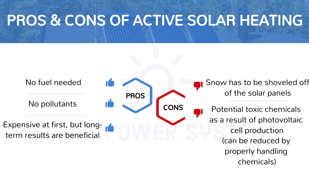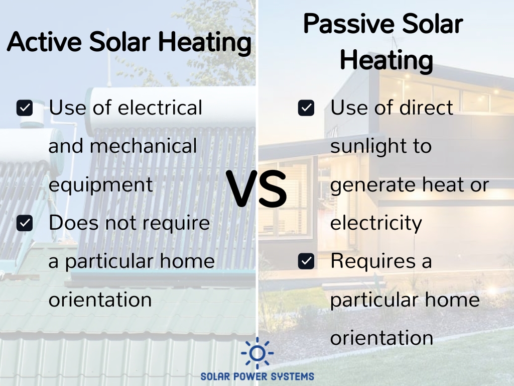 - In general, active solar heating systems exhibit greater efficiency in comparison to passive systems due to their utilization of turbines and blowers for heat distribution. They utilize, nevertheless, more energy to operate these supplementary components.