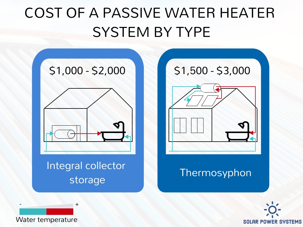 Another prevalent renewable energy source is passive solar water heating. Passive solar water heating operates without the need for mechanical components or working elements, in contrast to active solar water energy. By harnessing solar energy, this alternative heat source provides numerous householders with a more economical and ecologically sustainable alternative. Passive solar water heaters are an excellent and affordable solution for areas with plenty of sunshine since they use gravity and natural circulation to heat water. Geographical considerations, the dimensions of the area to be heated, and the architectural style of the dwelling can all impact the price of a passive solar water heating system. The installation of a passive solar water heating system typically costs homeowners between $1,000 and $3,700. Two types of passive solar water heating systems are the integrated storage collector and the thermosiphon, which are shown in the illustration below.
