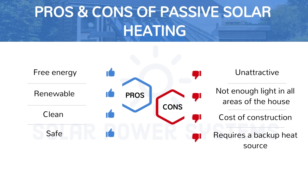 - Finally, it is necessary to consider the environmental friendliness of passive solar heating. Passive solar heating is an environmentally sustainable solution due to its reliance on natural resources and processes, which effectively mitigates its own environmental impact.